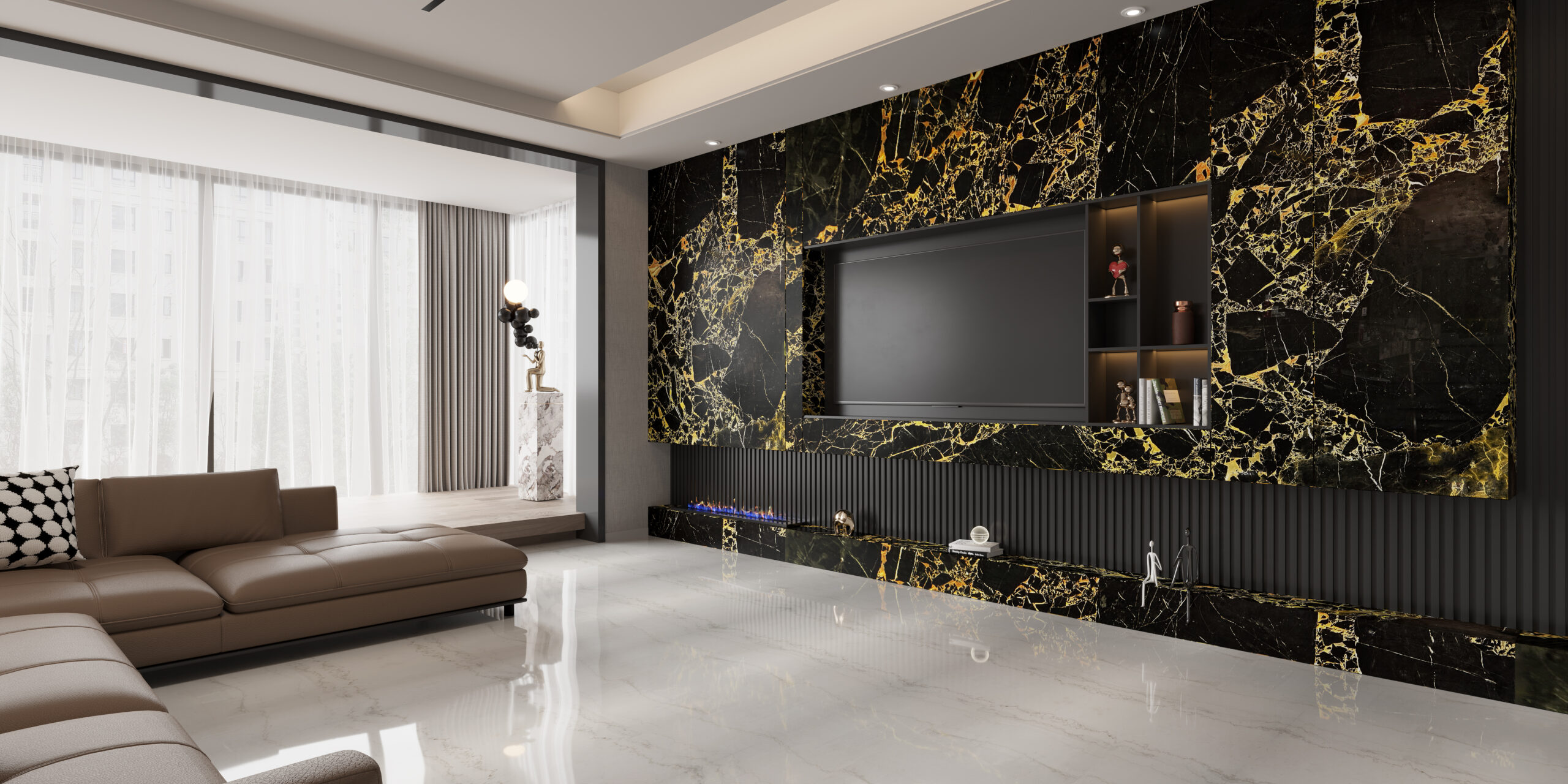 Golden Portoto (CH) marble presents a deep black base enriched with striking golden patterns that create a luxurious statement. Ideal for walls, flooring, and high-end interiors, this marble radiates bold elegance. Its unique veining ensures every slab is distinctive. Durable and timeless, Golden Portoto elevates spaces with dramatic beauty and refined presence.